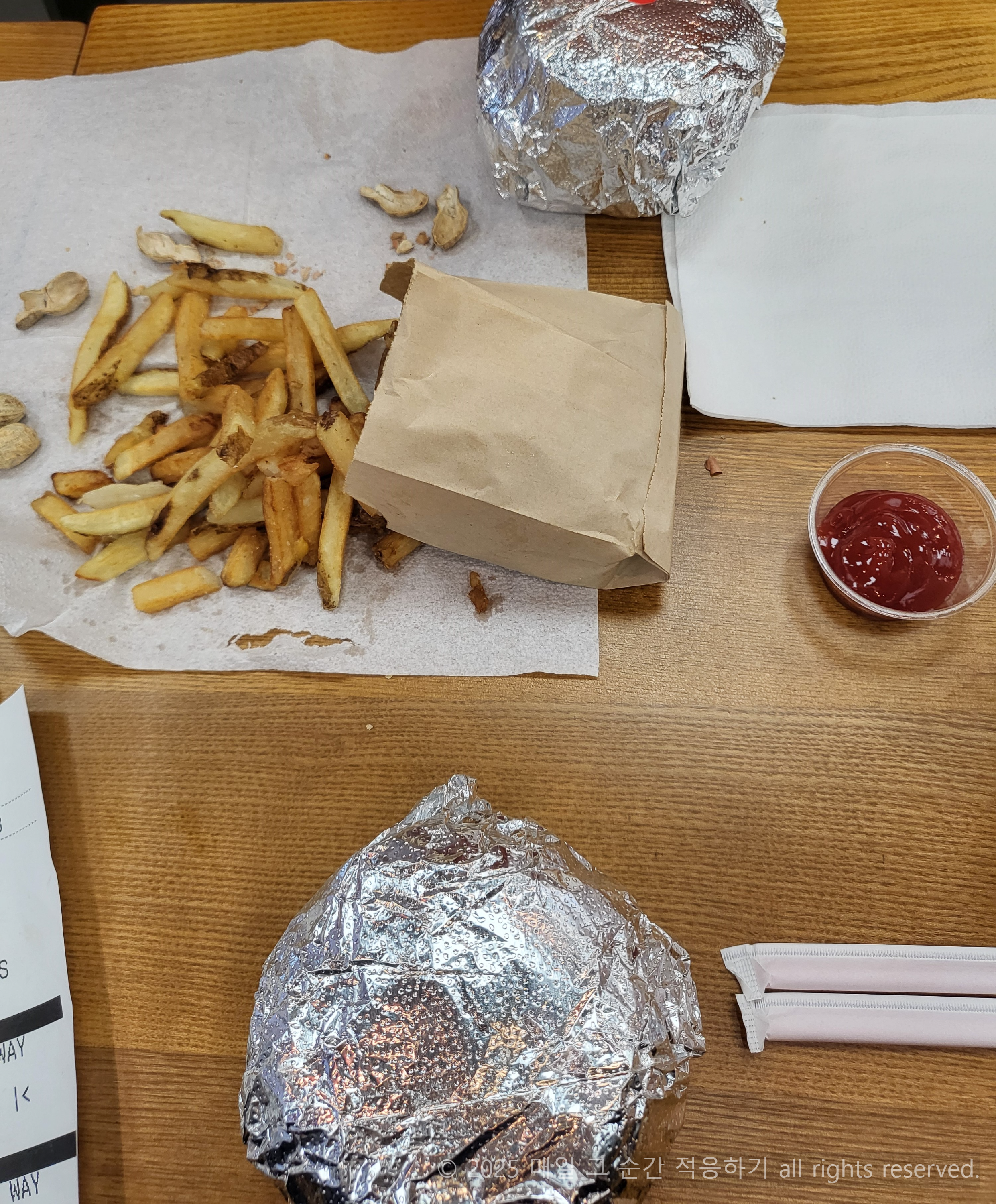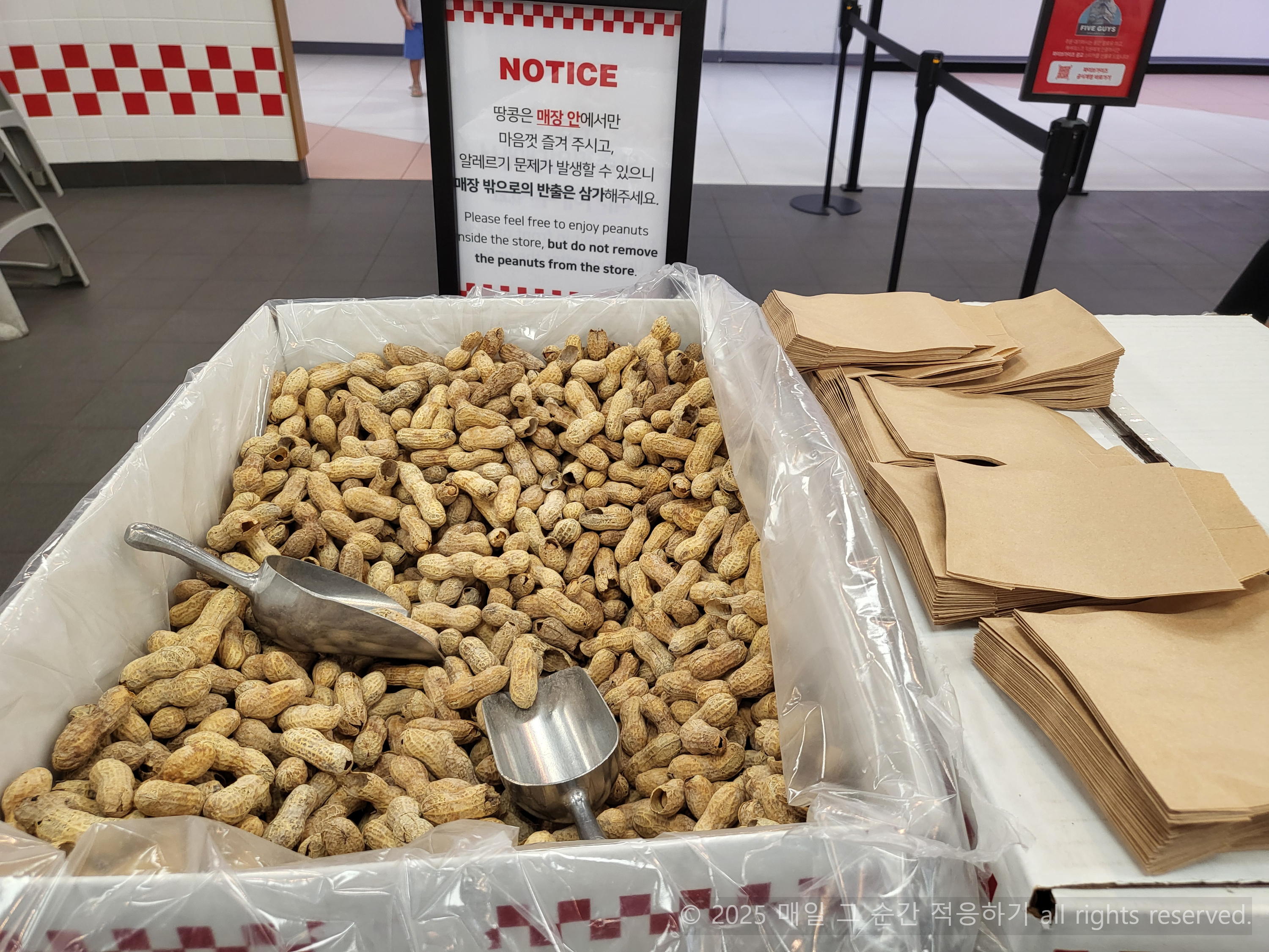 파이브가이즈의 또 다른 재미 땅콩 입니다 ㅎㅎ 소금이 짭짤하게 뿌려져 있어요. 옆에 있는 종이포장지에 원하는 만큼 담아갈 수 있어요. 기다리는 동안 즐기면 됩니다. 땅콩에 알레르기가 있는 사람이 많아서 외부로 가져가는 건 삼가달라는 안내문이 있습니다~! 알레르기가 없는 저는 행복하죠..ㅎㅎ