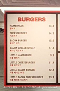 햄버거, 치즈버거, 베이컨버거, 베이컨 치즈버거로 총 4가지 메뉴입니다