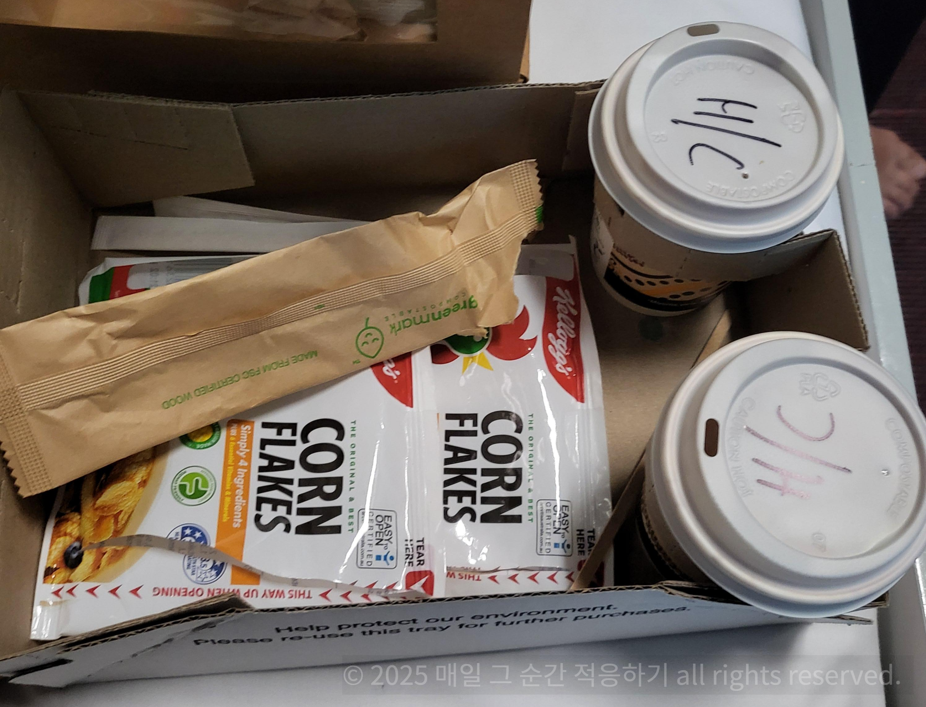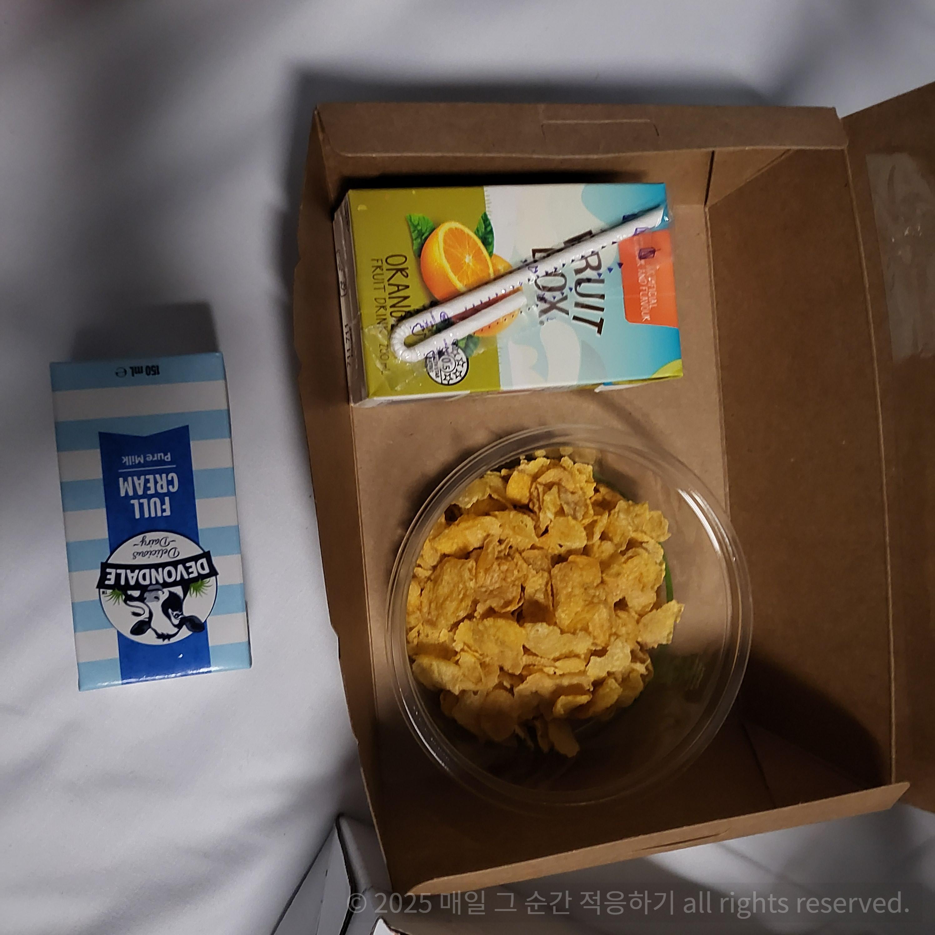 후레이크와 우유, 오렌지주스와 핫초코가 제공됩니다