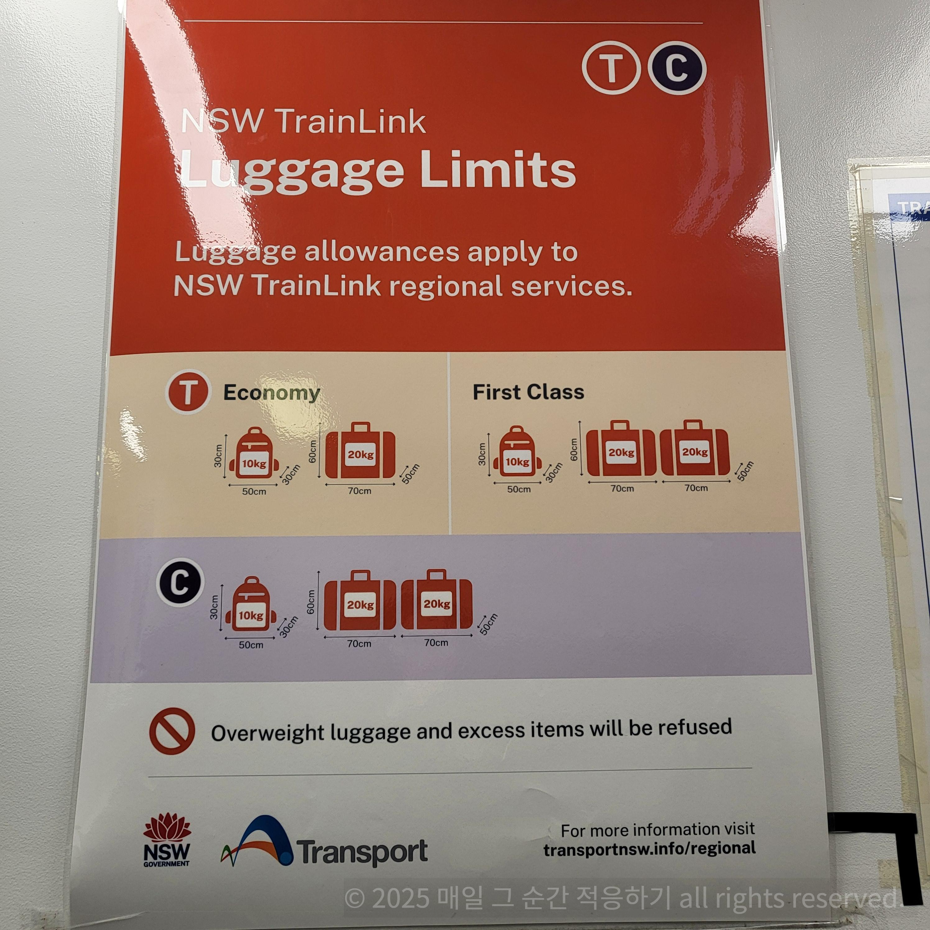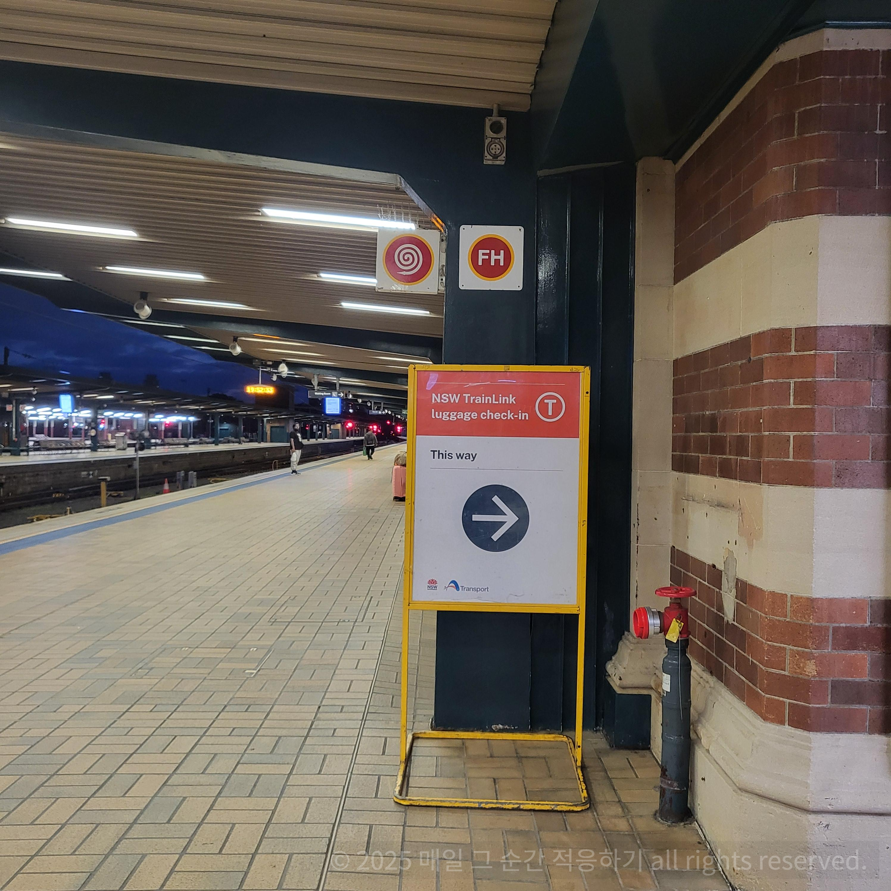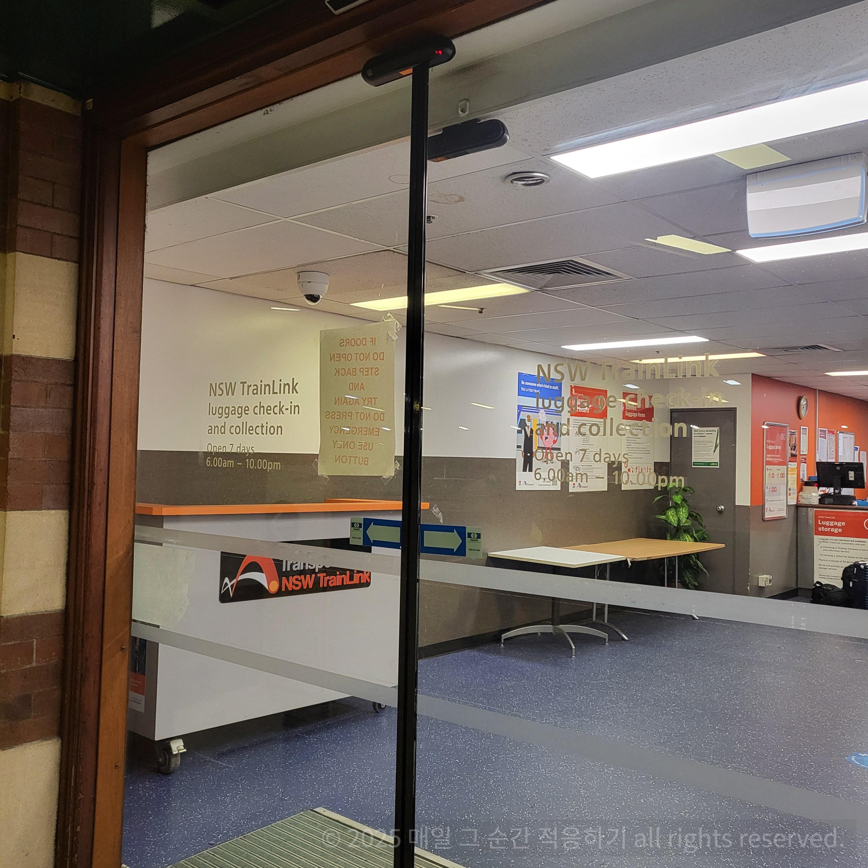 걸어오다 보면, NSW TrainLink Luggage Check-in이라는 표지판이 보이고 옆에 체크인 카운터가 있습니다