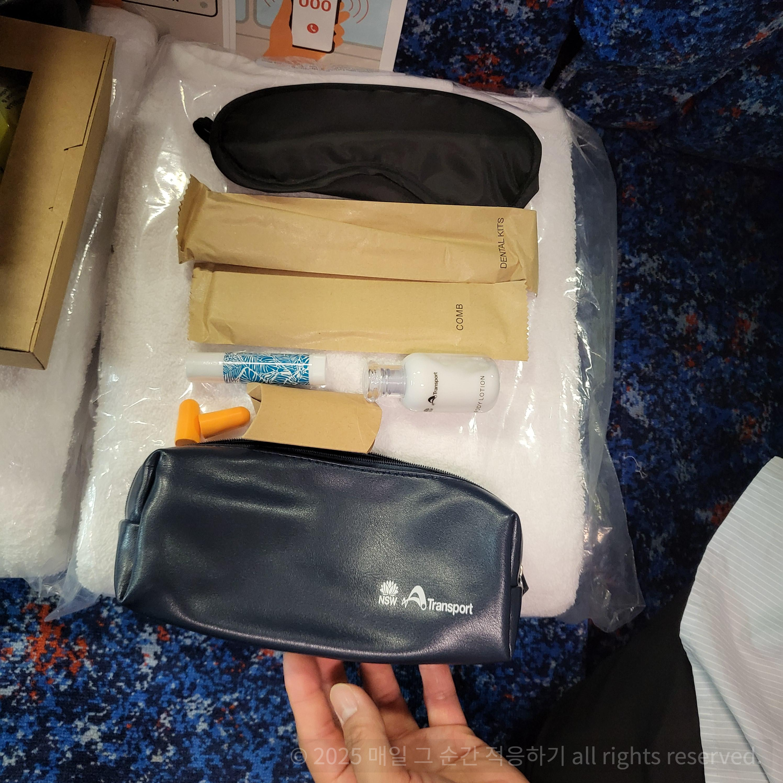 안대, 귀마개, 로션, 립밤, 칫솔과 치약이 파우치에 들어가 있고