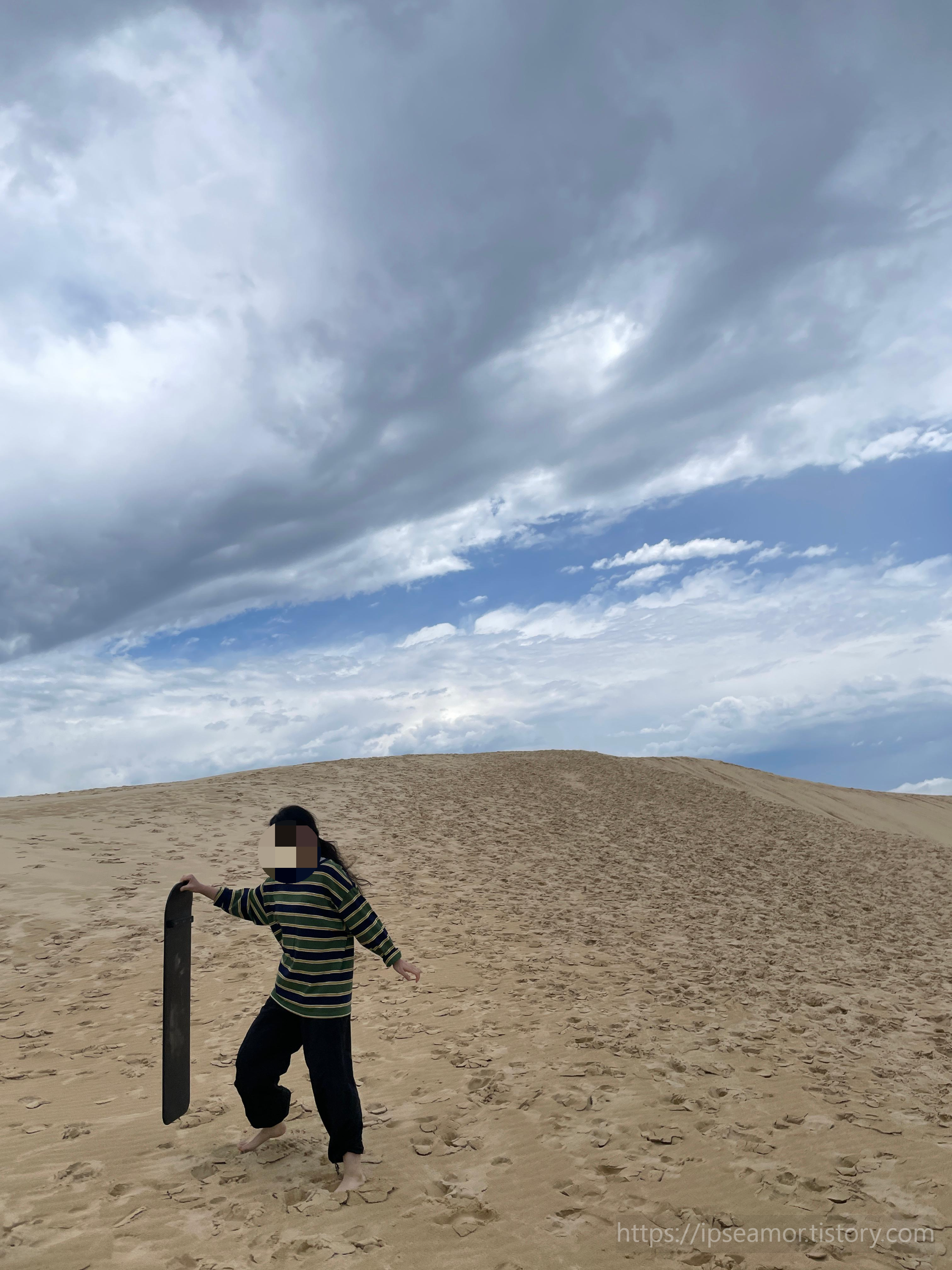 샌드 보딩을 타고 내려오면 다시 보드를 지고 올라야 해요