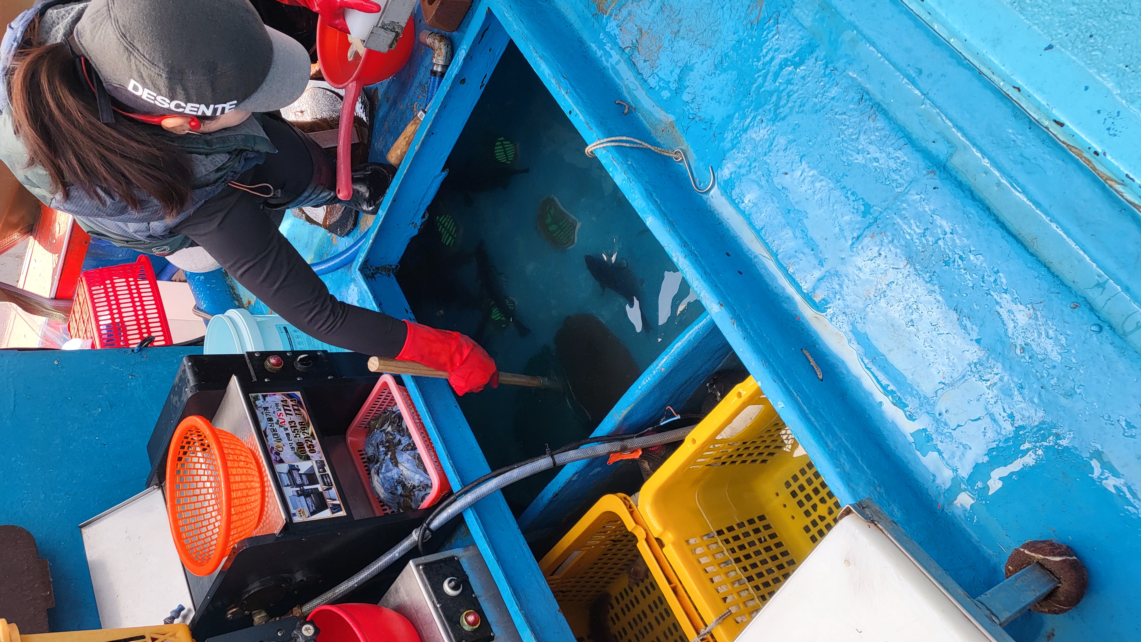 배 아래쪽에 어항에서 바로 생선을 건져서 빠르게 슥슥 썰어주셨습니다