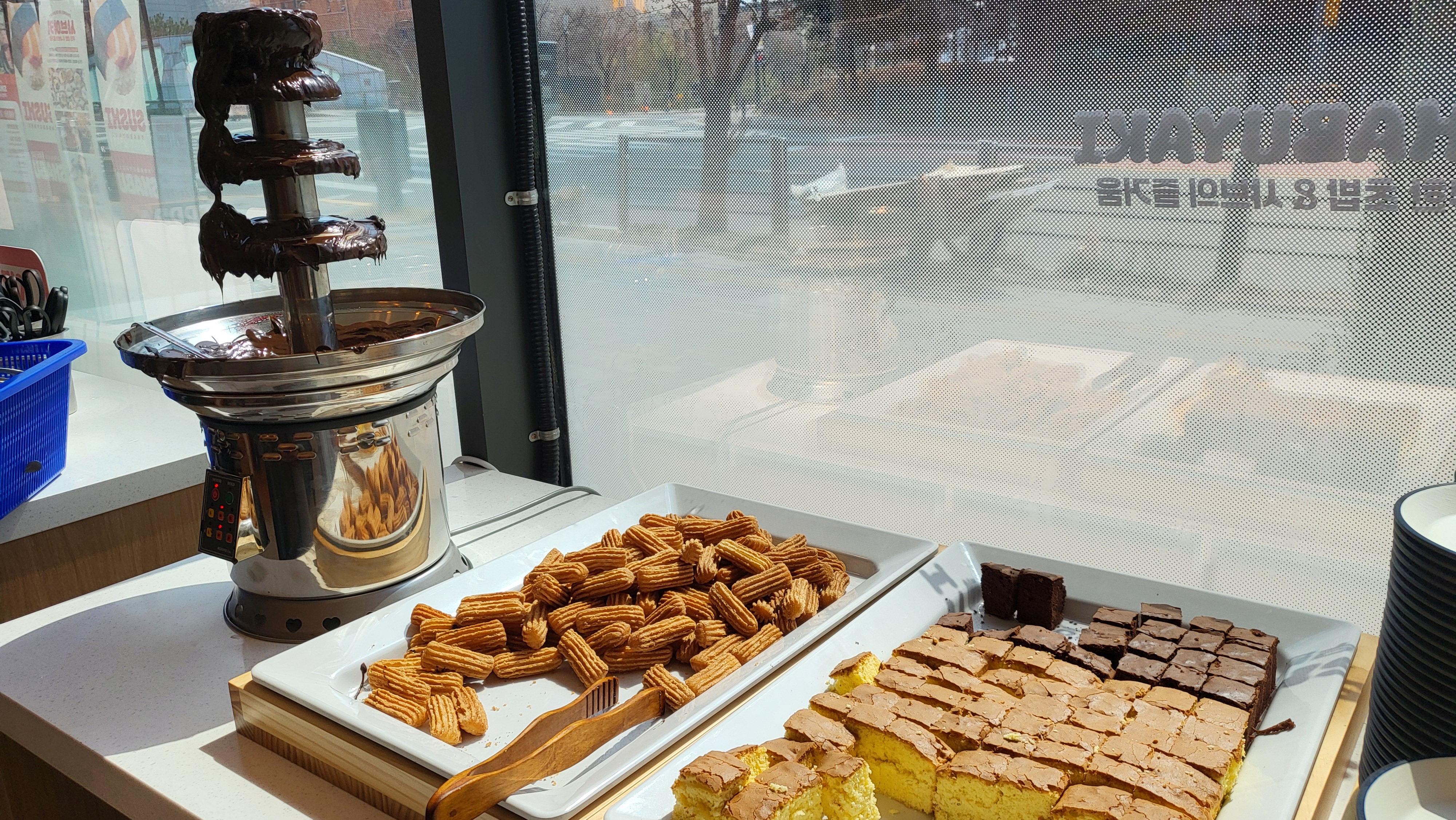 셀프코너에서 츄러스와 빵 그리고 원두커피기계로 커피를 내려마실 수 있습니다